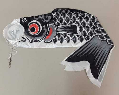 Black Fish Windsock. Printed Nylon material. Clip and swivel included. Dimensions are: 25cm x 100cm.