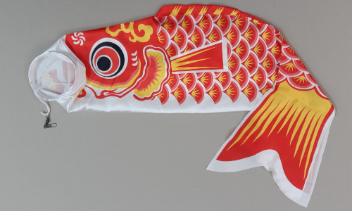 Red Fish Windsock. Printed Nylon material. Clip and swivel included. Dimensions are: 25cm x 100cm.