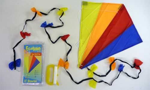 Ripstop nylon sail on a fiberglass frame ,twisted nylon flying line included (approx. 10kg x 60m). This one is good for kids that are 5 years and over. 45cm wide ,47cm high with a 2.45 m tail.